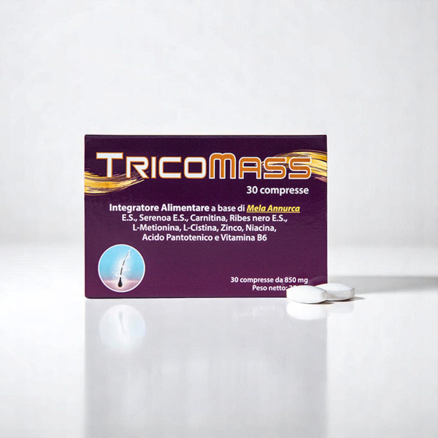 Tricomass è un integratore alimentare prodotto da Kanter Pharma, specificamente formulato per favorire la salute e la bellezza dei capelli. Grazie alla sua combinazione di principi attivi, contribuisce a rinforzare i capelli, a stimolarne la crescita e a migliorarne l'aspetto generale. Tricomass agisce su più fronti per contrastare la caduta dei capelli e favorirne la crescita: