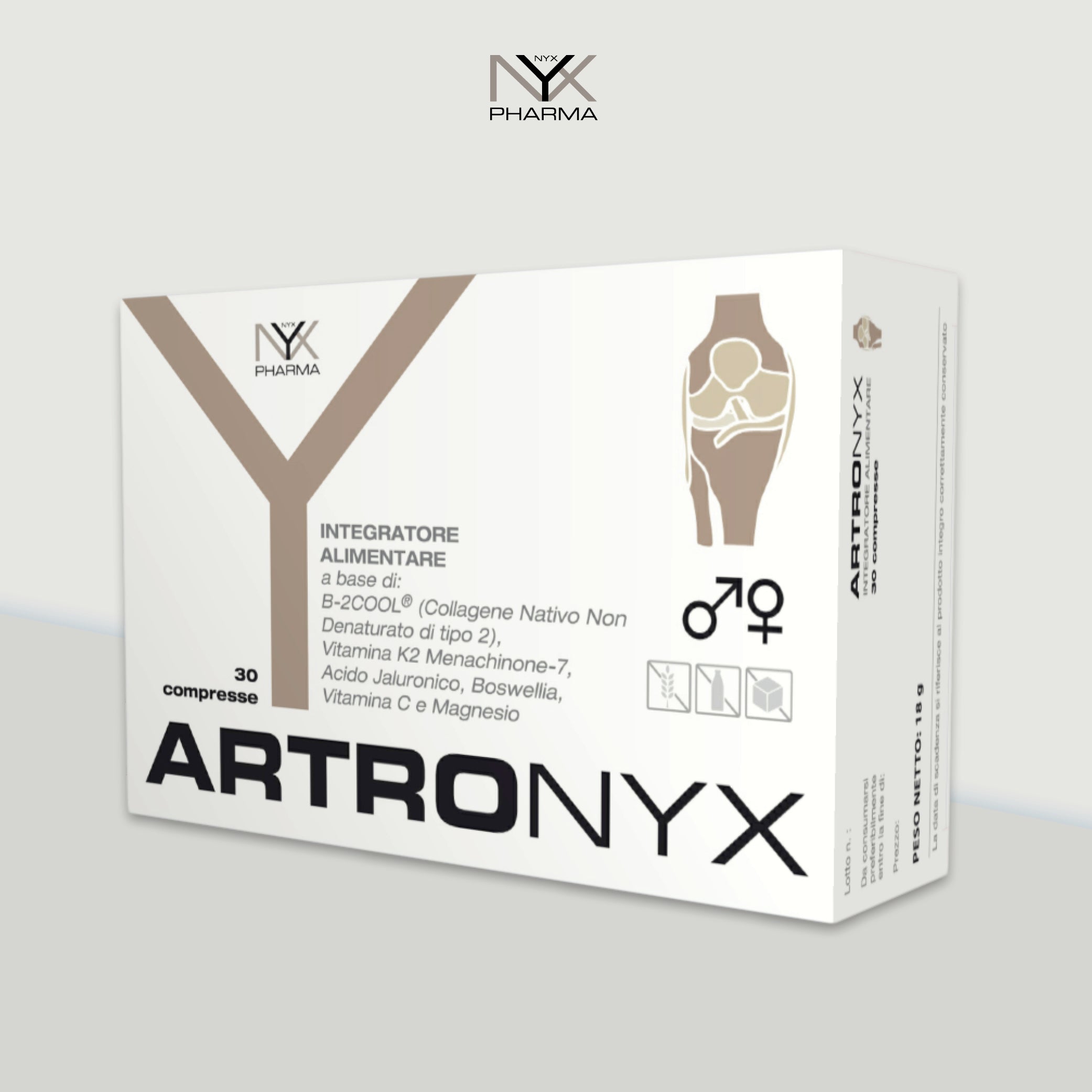 ARTRONYX è un integratore alimentare innovativo a base di Collagene Nativo Non Denaturato di tipo 2, Acido Jaluronico, Boswellia, Vitamina C, Vitamina K2 Menachinone-7 e Magnesio.