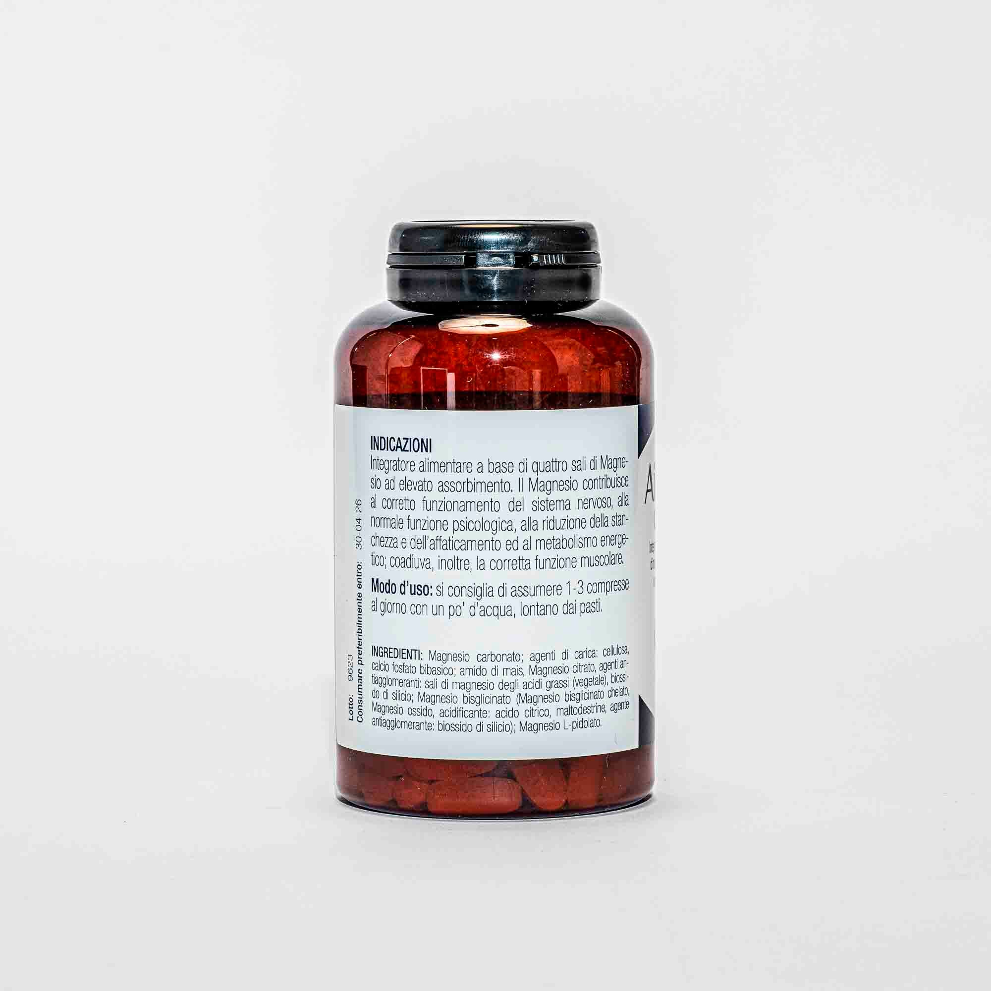 Food supplement based on four Magnesium salts with high absorption. Magnesium contributes to the correct functioning of the nervous system, to normal psychological function, to the reduction of tiredness and fatigue and to energy metabolism; it also helps the correct muscle function.
